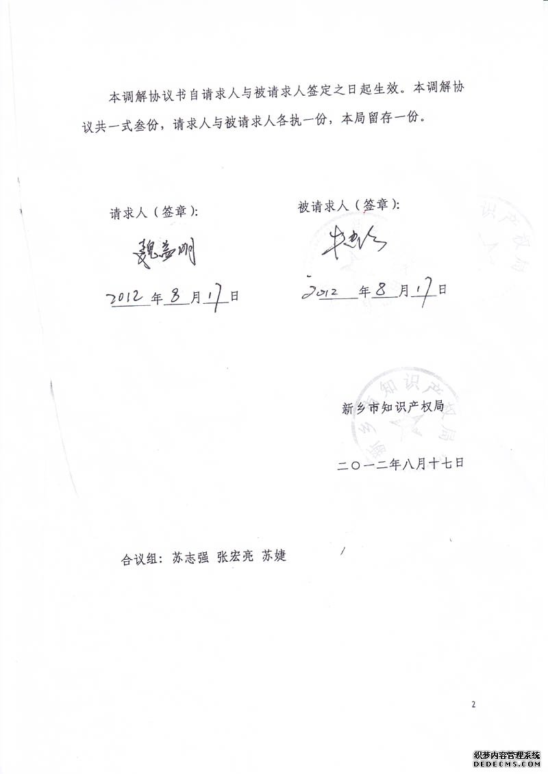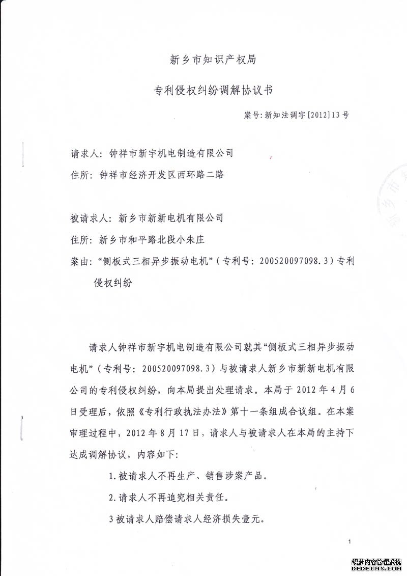 新乡市知识产权局专利侵权纠纷调解协议书