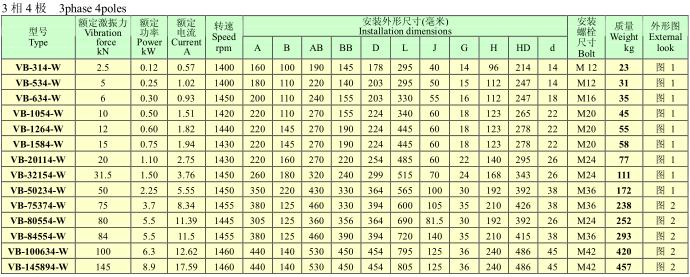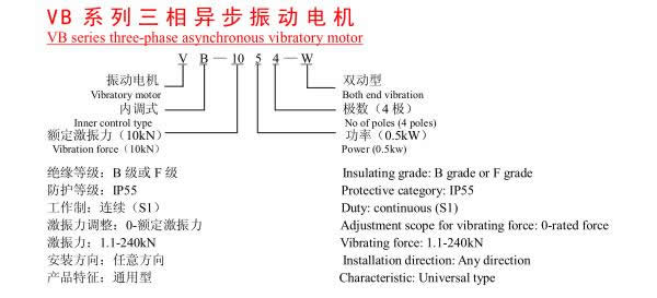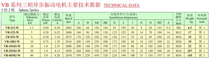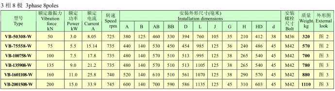 VB系列振动电机,功率0.12~25KW,2、4、6、8极,激振力为2.5~300KN,共计56个规格。
