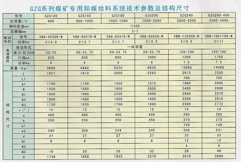 GZG系列煤矿专用卸煤给料系统主要由溜槽、给料机机体、VVB系列振动电机、减振装置、辅助吊挂、电液平板闸门(小规格的可以采用齿轮齿条手动闸门)等组成。