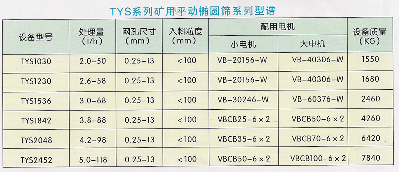 TYS系列矿用平动椭圆筛利用“单质体双轴惯性振动筛力心理论”和“双轴不等质径积(矩)追随自同步和同步状态稳定性理论”,选用两组不等质径积比的振动电机做激振源,实现振动筛平动椭圆振动。
